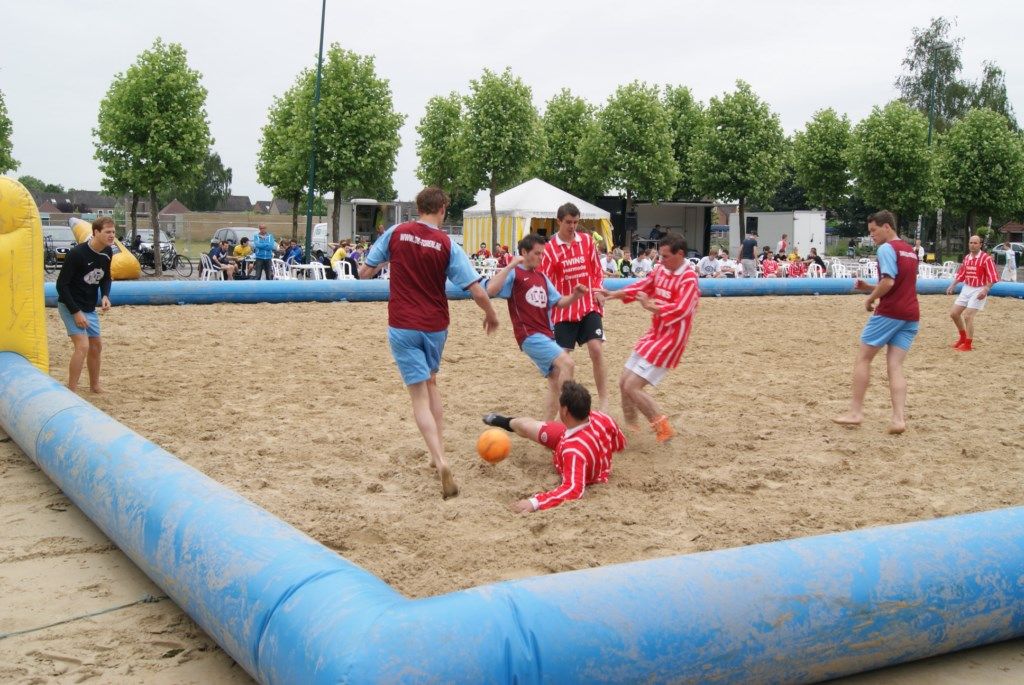 Ingrediënen: een hoeveelheid strandzand, een door lucht opgeblazen boarding, twee goals, een aantal scheidsrechters en een tiental beachsoccerballen. Het beachvoetbaltoernooi mist alleen nog de verzengende zon als belangrijkste ingredient. Maar daar storen de ongeveer 75 voetballers zich niet aan. Op blote voeten en een enkeling op kousevoeten gaan de team van vijf spelers in de arena de strijd met elkaar aan. In wedstrijdjes van tien minuten wordt steeds de winnaar bepaald.