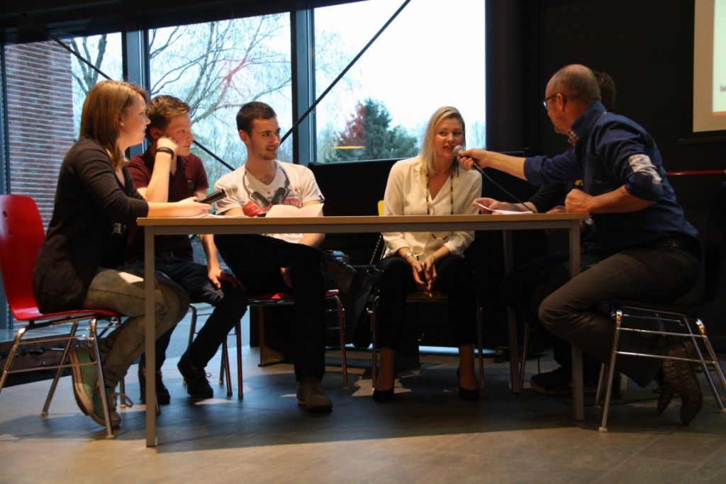 van de avond ging zij in gesprek met leerlingen van 5 Gymnasium. De gymnasiasten hadden zich uitstekend voorbereid. Zij hadden enkele filmpjes gemaakt, o.a. over de geloofsbeleving door de opa en oma van één van hen en met 2 interviews met studenten over hun studentenleven en het wonen in een studentenhuis. Ook hadden zij haar boeken vergeleken met boeken van Jan Wokers, Jan Siebelink en Maarten 't Hart over hun streng gereformeerde opvoeding.