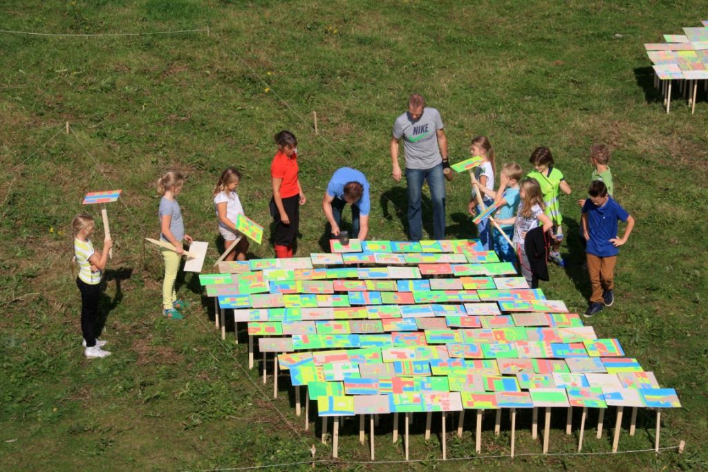 Vanmiddag kwamen kinderen van De Bolderik over het voetpontje met hun tegel. Even later kwamen kinderen van 't Mozaïek met hun tegel. Alle tegels worden op houten paaltjes geschroefd, die in de grond worden getimmerd. Klik hier voor foto's.