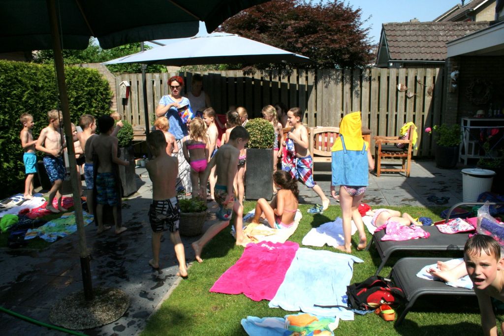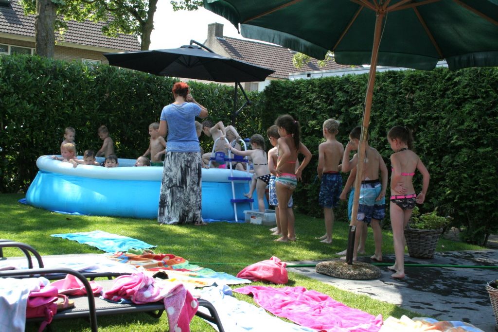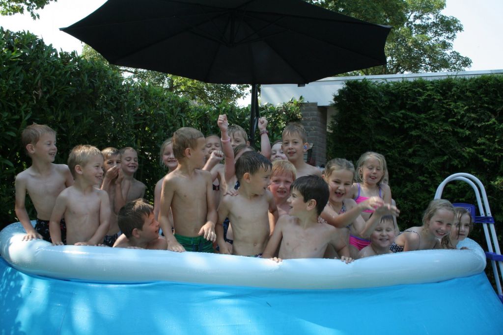 Vanwege het tropisch warme weer hebben zich op de basisschool in Dinther verrassende activiteiten ontplooid. Groep 3a van ' t Palet was bijvoorbeeld uitgenodigd bij een van hun klasgenootjes om te genieten van een heerlijke verfrissende duik. Wat een plezier!