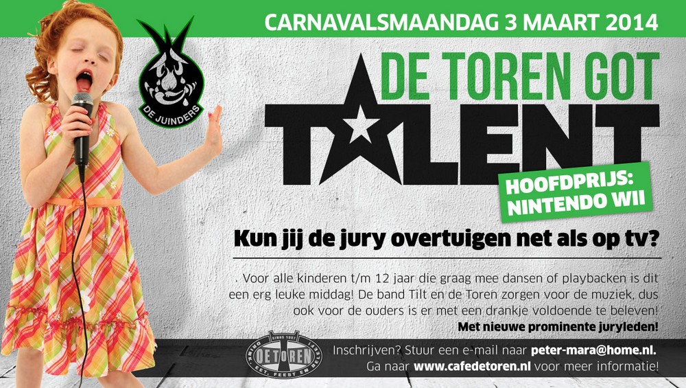 Speciaal voor de kleintjes is er in samenwerking met de Juinders De Toren Got Talent in de grote zaal. Wie van de kids heeft ‘the T-Factor en gaat er met de hoofdprijs (een splinternieuwe TABLET) vandoor?Er zijn veel leuke prijsjes te winnen voor de kinderen en deelname is mogelijk voor zowel playback als dans. Kinderen t/m 12 jaar oud kunnen zich aanmelden door het sturen van een e-mail naar