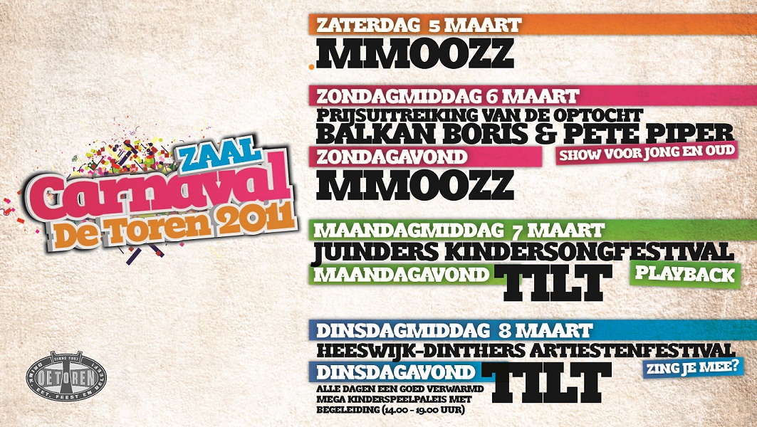 Heeswijk-Dinther leeft weer richting carnaval. De carnavalspakken worden gekocht of van zolder afgehaald, want carnaval 2011 staat voor de deur. Deze beleving is ook bij de Toren weer volop aan de gang! In Snevelbokkenland kan iedereen bij de Toren terecht voor een bruisend carnaval.Van klein tot groot, ook dit jaar weer voor ieder volop beleving met 5 dagen lang een kei gezellig programma!
