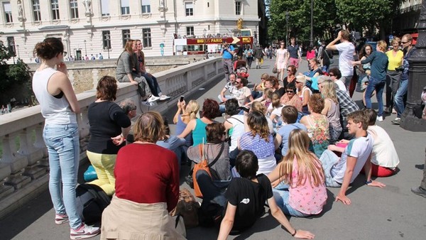 Op een brug over de Seine mogen de mooie Esmeralda en haar vriendin Sabine hun scène spelen. De rest van de groep ploft op de grond, de brug lichtelijk afsluitend voor de andere voetgangers. En ook hier blijven de voorbijgangers staan, verwonderend kijkend wat er gebeurt daar op die brug.