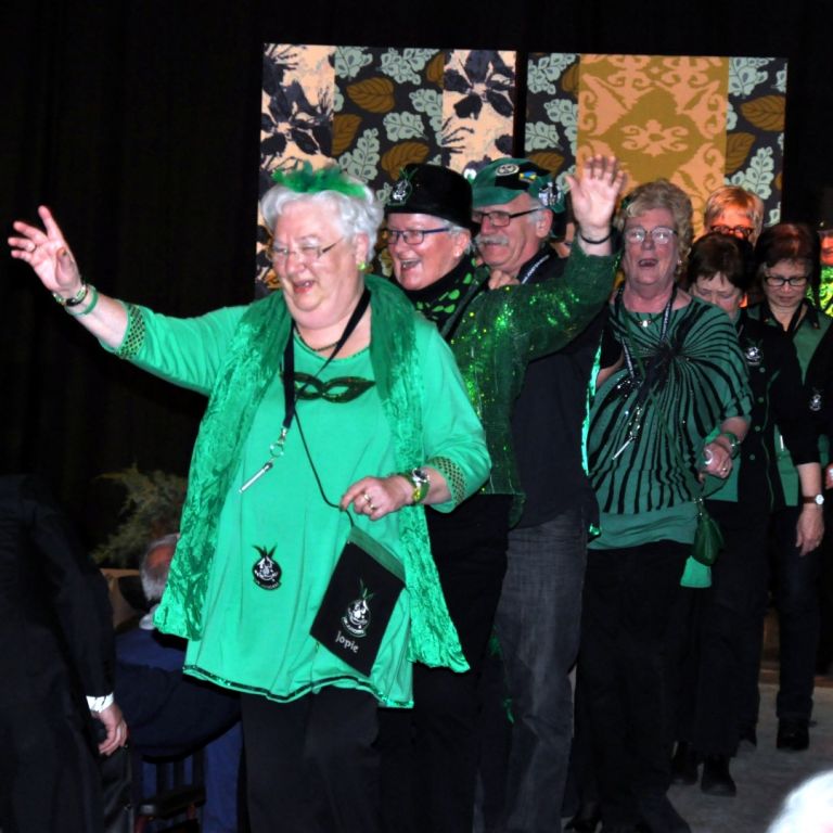 De hofdames, normaal heel kleurrijk kwamen deze keer in zwart/wit met een prachtige act. Ook de Jantjes deden 16 jaar geleden al mee en deze avond zongen ze weer een medley uit de bekende musical.
