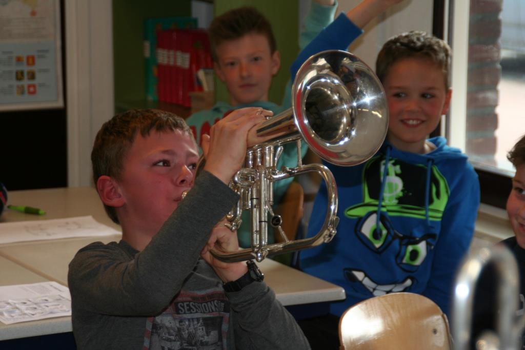 Met bolle wangen, rode gezichten, enorm enthousiasme en steeds priemende vingers in de lucht zijn de kinderen van groep 5 van basisschool 't Mozaïek deze middag betrokken bij de les. Niet hun juf Janneke, waar ze normaal les van krijgen, maar 'juf' Angela van Berloo van fanfare Sint Willibrord boeit de kinderen met een bijzondere muziekles. Vier keer verzorgen vrijwilligers van harmonie Sint Servaes en fanfare Sint Willibrord in alle groepen 5 van de basisscholen in Heeswijk, Dinther en Loosbroek Windkracht 6: een aanstekelijk muziekproject om kinderen kennis te laten maken met harmonie- en fanfaremuziek. Met succes!