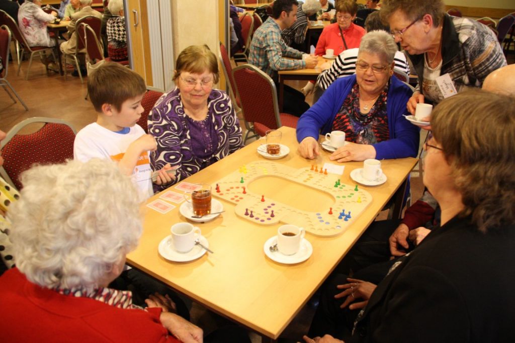 Om half 2 startte de spelmiddag. De vrijwilligers hadden al hun gezelschapsspelen uit de kast getrokken, zodat de gasten van de Zonnebloem volop keus hadden. Aan tafels speelden de gasten samen met de 11 vrijwilligers van het IPG-Bernheze onder andere het populaire Rummikub, bouwden ze een Jenga-toren of raadden ze vragen bij Pim-Pam-Pet. Daarnaast werd er ook veel gerikt en waagde een aantal gasten zich aan een wedstrijdje sjoelen. Kortom: gezelligheid alom!