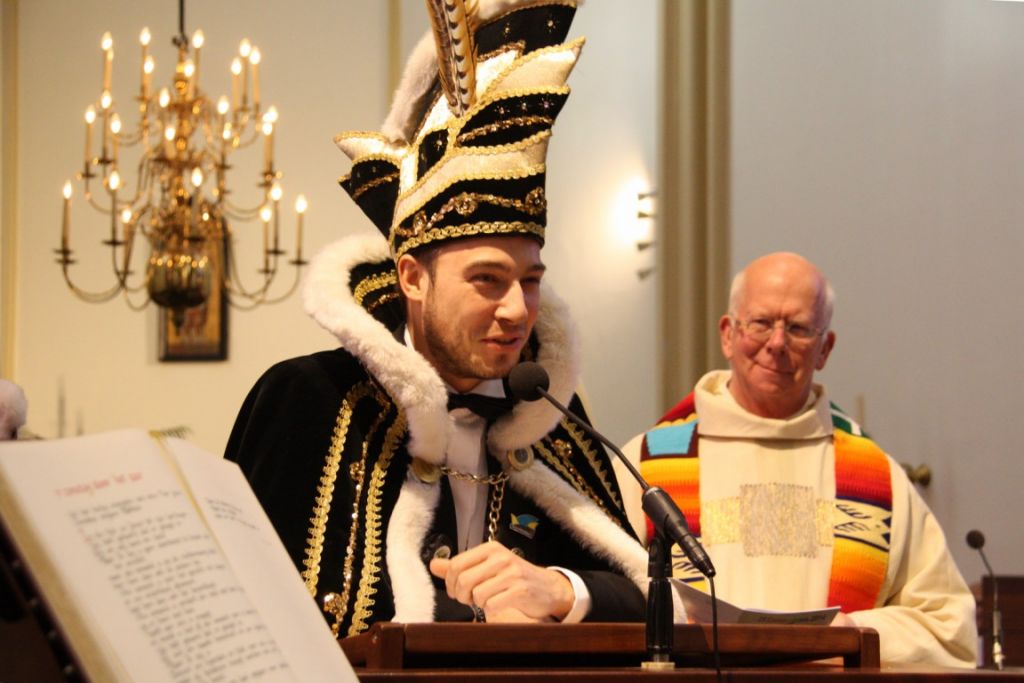 De Kornuiten verzorgen de muzikale opening op het altaar. De Prins en de Jeugdprins met hun gevolg betreden als laatste kerkgangers de volle Servatiuskerk.