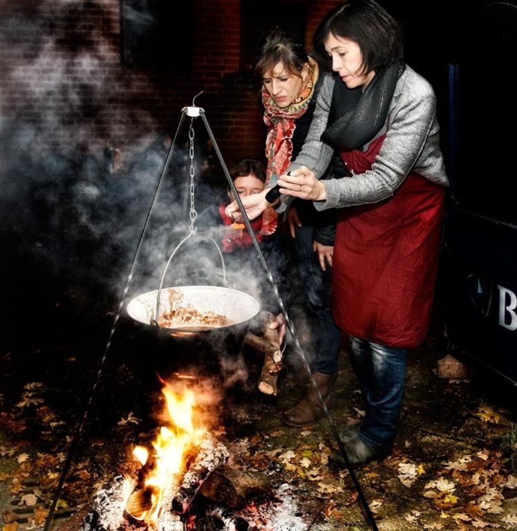 De prachtige locatie met de zeer smaakvol ingerichte ontvangstruimte en keuken voldeed helemaal aan de eisen die de dames voor ogen hadden. Met de biologische kip en het scharrelvarken van Rob konden de gerechten worden bereid. Niets was Rob te veel om de dames een goede avond te bezorgen. De houtkachel werd ‘s morgens al opgestookt zodat het lekker warm was bij binnenkomst. Buiten stond de rookkachel al klaar voor de kip en de stoofpot hing al aan de driepoot boven het vuur voor de varkensstoofpot. Na een paar uur hard doorwerken door de dames om het vuur op de juiste temperatuur te houden konden ze volop genieten van het heerlijke vier gangenmenu. Conclusie: een aanrader voor kleine kookclubs die graag een leuke uitdaging aangaan en verwelkomt willen worden door de gastvrije Nanda en Rob.
