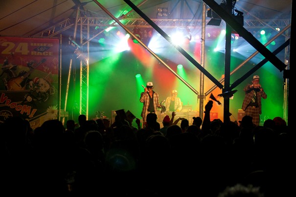 size het publiek verwennen. Zodra er met de finishvlag wordt gezwaaid knallen de mannen van WC Experience het complete dak weer van de tent.