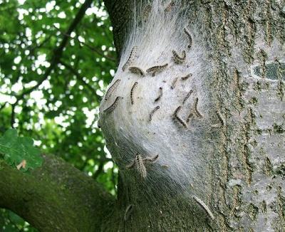 De nesten ven de eikenprocessierups komen voor in inlandse eiken. U herkent ze aan het grijze spinsel dat eromheen zit. De nesten zijn meestal zo groot als een handbal.