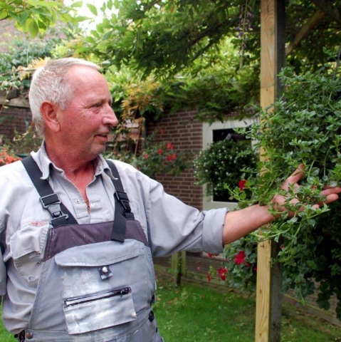 Sinds dat Harry niet meer voor een baas hoeft te werken kan hij volop genieten van zijn tuin. En dat hij ‘groene vingers’ heeft is meteen te zien aan de uitbundig bloeiende fuchsia’s in de tuin. Maar ook de tomaten, in zijn eigen gemaakte kas, groeien als kool. Met enige trots vertelt hij dat de fuchsia’s bijna allemaal zelf gestekt zijn. In de uitverkoop kocht hij eens een aantal vetplanten. Door ze te stekken hebben deze zich flink vermeerderd en zijn ze overal in de tuin terug te vinden. Zelfs het stekje dat hij van zijn vakantie op Rhodos heeft meegebracht doet het hier uitstekend. Klik hier voor foto's.