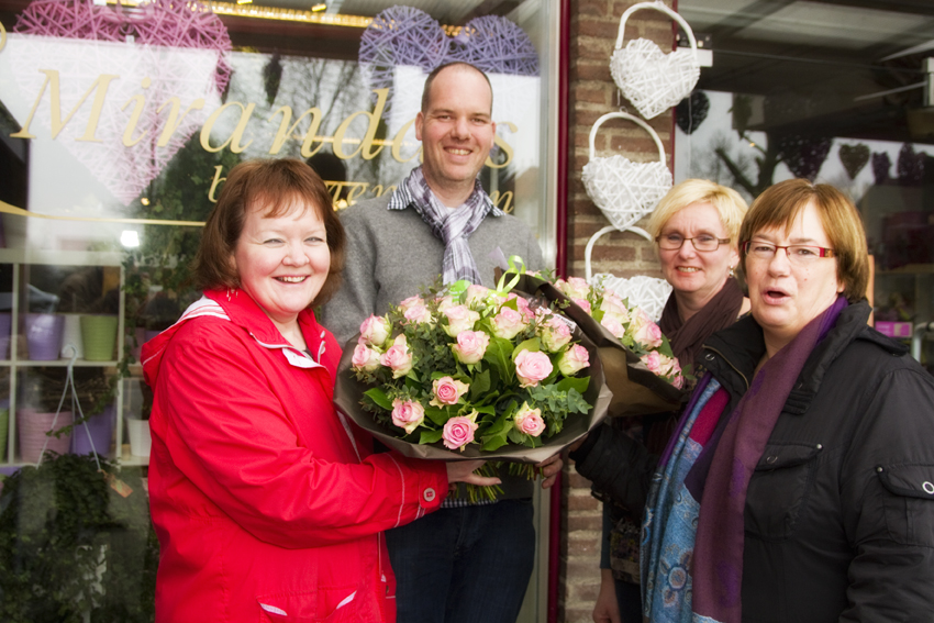Op zaterdag 12 februari werden 2 deelnemers van de Valentijnsaktie verrast met een telefoontje en het verzoek om om 14.00 uur naar Miranda’s Bloemensalon te komen. Uit handen van Hans van den Reek van Miranda’s Bloemensalon en Marijke den Otter, PR-medewerkster van de Wereldwinkel Heeswijk-Dinther, ontvingen de winnaars, Johanna van Lankveld en Elly Verkuijlen, een prachtig boeket Fairtrade rozen.
