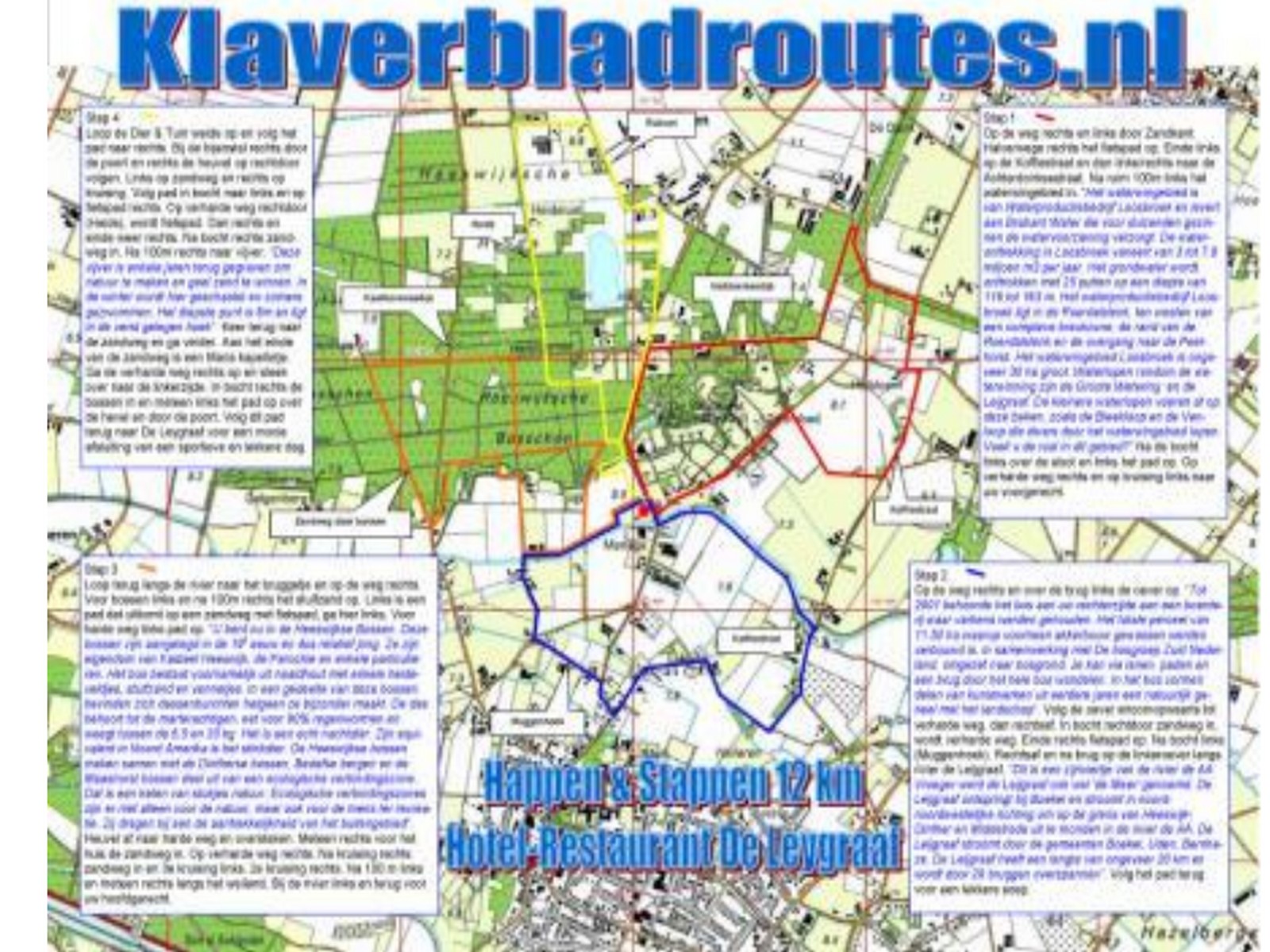 Klaverbladroutes.nl biedt de keuze om vanuit één restaurant te happen & stappen of te happen & trappen. Het restaurant is het klaverblad middelpunt van waaruit vier korte wandelroutes van elk 3 km en vier fietsroutes van elk 12,5 km zijn uitgestippeld. Het restaurant heeft een heerlijk menu samengesteld waarbij na elke route een gerecht wordt gegeten. Er kan worden gekozen uit een vier- of vijf-gangenmenu. Voordeel van het Klaverbladroutes systeem is dat men na elke route in hetzelfde restaurant terugkomt. Mocht een regenbui opdagen dan kan men van de volgende dinergang gebruik maken, of ’n deelnemer kan niet meer en wil afhaken dan kan deze een route overslaan en even rusten. Een aanpassing is bij Klaverbladroutes dus direct mogelijk en hierdoor gebruiksvriendelijker dan andere routes.