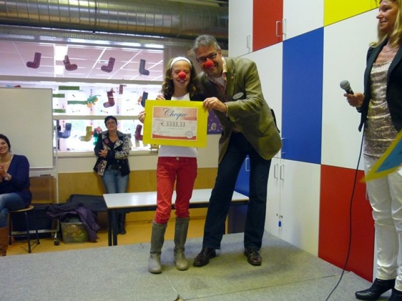 De aula van basisschool Het Mozaïek in Heeswijk zat gisteren tjokvol kinderen voor de officiële uitreiking van cheques aan stichting Actie Calcutta en stichting CliniClowns.
