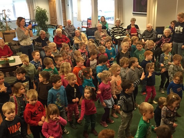 De ouderen van verzorgingshuis Cunera/De Bongerd en de jongste kinderen van Basisschool Het Mozaïek, Peuterspeelzaal Hummelhonk en KDV Klein Drakenstein genoten dinsdagmiddag in de Tuinzaal van Laverhof in Heeswijk van de voorstelling van Wiebelbillenboogie.