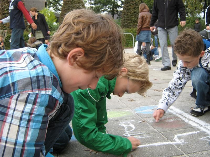 Er werd volop gekleurd op diverse plekken van de speelplaats. Simone Ketelaars uit groep 5 had een trein  getekend met allerlei poppetjes er in. Jeroen Ketelaars, Kane van Wanrooy en Mika van Venrooij tekenden een eiland met megadieren. “ Kijk, hier vliegt een reuzenmier naar het eiland “ , wisten de drie jongens te vertellen.