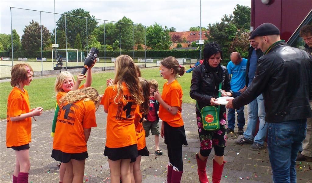 Met een groot spandoek keerde de E1 terug van haar spannende uitwedstrijd die met 1-2 werd gewonnen van Oss. Vrolijk, in oranje T-shirts met de tekst ‘ME1 kampioen ’11-12’, zette het team de club op zijn kop. Daarnaast zorgde begeleiders van het team voor confetti, een lekkere slagroomtaart en kinderchampagne.