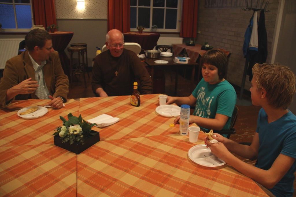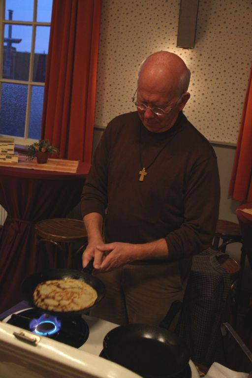 Joost Jansen bakte vanavond pannenkoeken voor jongeren in het Willibrordcentrum. Ze smaakten voortreffelijk. De jongeren waren zeer geïnteresseerd in de verhalen van Rob Cremers over zijn werk als kantonrechter en de dilemma's waarmee hij wordt geconfronteerd. Een interessante bijeenkomst die veel meer belangstelling verdient.