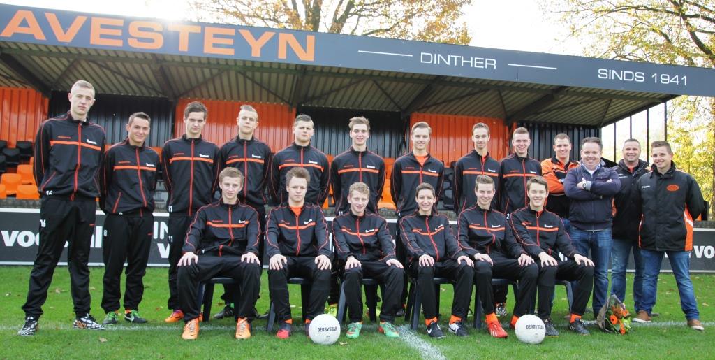 141122 AvesteynA1_shirtsOp zaterdag 22 november jl. kreeg de A1 van RKSV Avesteyn nieuwe kleding uitgereikt. Alle spelers kregen en een volledig wedstrijd tenue (shirts, broekjes en sokken) en een trainingspak. Jeroen van den Broek van Café Zaal de Toren uit Dinther, sponsor van dit alles, sprak het team toe en wenste de spelers en de leiding veel plezier met de kleding.