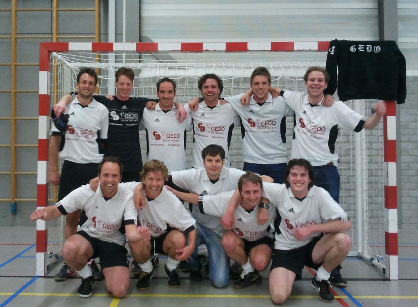 Foto: Het kampioensteam van GEDO Elektro. Bovenste rij van links naar rechts: Stephan de Laat, Luuk Verkuijlen, Danny van de Graaf, Tommie van den Berg, Luc Gosselink en Geert van Gerwen. Onderste rij van links naar rechts: John Rovers, Fons van Nuland, Gijs Heerkens, Sjoerd Swinkels en Joep Konings. Op de foto ontbreekt Ton van Katwijk.