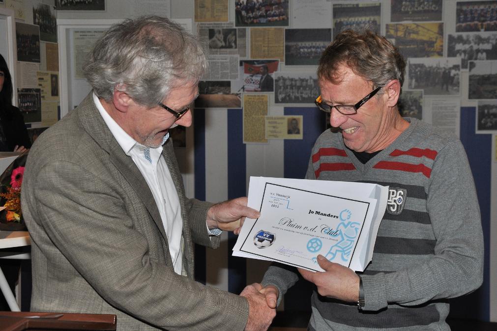 Supervrijwilliger Jo Manders kreeg de Pluim zondagmiddag in het bijzijn van zijn familie uitgereikt door voorzitter Peer Verkuijlen. Tijdens de zeer druk bezochte bijeenkomst werd Jo volledig verrast. Volgens de voorzitter is Jo iemand die heel veel tijd besteed aan de voetbalvereniging maar nooit echt opvalt. “Dat is tekenend voor hem, bescheiden heel plichtsgetrouw zijn werk doen.” Jo was en groot sportman en speelde jaren in het 1e en 2e team van Heeswijk. Daarnaast had Jo een carrière als marathonloper wat hem zeer goed af ging. Vanwege fysieke problemen moest hij de actieve sport achter zich laten en ging verder als jeugdscheidsrechter en met het verrichten van dagelijkse werkzaamheden op en rond het sportpark. Ook elk weekend is Jo mede gastheer en begeleider van scheidrechters en clubs die Heeswijk bezoeken. De toekenning van de Pluim werd ook met groot enthousiasme en instemming door de vele aanwezigen ontvangen.