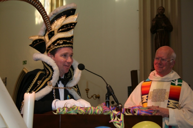 Pastoor Joost Jansen haakte fijntjes in op Prins Joost D’n Urste’s motto: 'banden heb je niet alleen om te verkopen'. Maar banden heb je met vrienden, familie en iedereen om je heen. Een mooie spreuk om de carnaval door te komen. Natuurlijk werd de carnavalsmis afgesloten met het bekende Snevelbokkenlied, waarna de meeste mensen de straat over staken om bij de Toren de sleuteloverdracht bij te wonen.