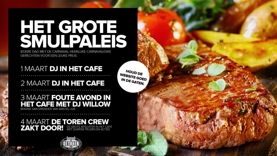 In hét Grote Smulpaleis (café) in de vooravond heerlijke carnavals gerechten voor mooie prijzen en uiteraard na het eten in de avonduurtjes écht feest met dj’s en borreltjes..