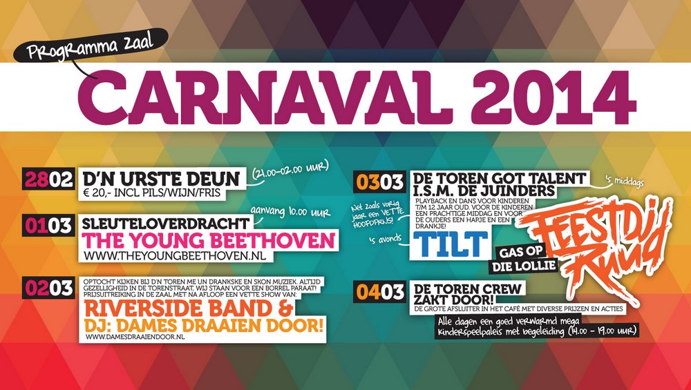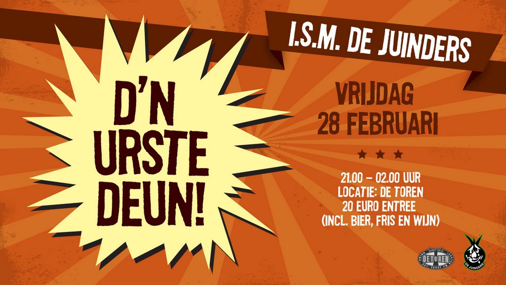 Al niet meer weg te denken bij de Toren en ook dit jaar dus weer op het programma. Samen met carnavalsvereniging ‘De Juinders’ organiseren we D’n Urste Deun, wat een geweldige aftrap is van Carnaval 2014. Voor € 20,- is het de gehele avond pils/wijn/fris. De zaal is open vanaf 20.00 uur. Onder muzikale begeleiding van de diverse blaaskapellen uit HDL maken we er met z’n allen een gezellige avond van en zullen we eens kijken of de nieuwe prins(es) zich kan meten met de échte carnavalsvierders.