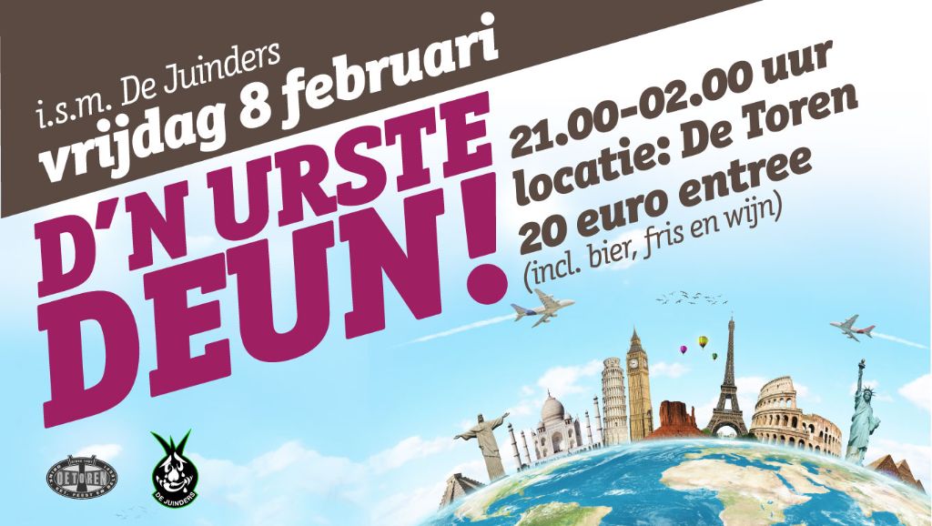 Dé aftrap van carnaval in HDL beleef je samen met De Juinders, huis blaaskapel van de Toren. Tijdens d’n Urste Deun kan iedereen van 21.00 – 02.00 uur genieten van de diverse blaaskapellen die om beurten spelen op 2 verschillende podia in de zaal. De entree is € 20,- inclusief onbeperkt bier/wijn/fris.