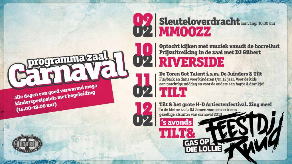 Dinsdag nog éénmaal alle remmen los bij de Toren met verschillende optredens van bekende en misschien wel onbekende hadeejers met het Heeswijk-Dinthers Artiestenfestival. De grote zaal zal gevuld zijn met artiesten en publiek in een altijd zeer gezellige en ongedwongen sfeer. Zing gerust mee! TilT zal alles ondersteunen en zal aan het begin van de avond ook zelf de afsluiter van carnaval 2013 inzetten. Wanneer iedereen weer op de dansvloer staat bij TILT zal hierna FEESTDJRUUD het geheel nog even heerlijk opzwepen. Op alle grote festivals is hij te vinden en is dan ook ná de geweldige afsluiter met DJ Paul Elstak vorig jaar dan ook een waardig opvolger!