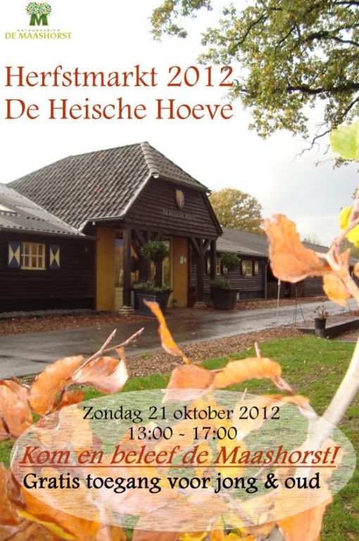 Aanstaande zondagmiddag 21 oktober vindt bij De Heische Hoeve in Loosbroek de Herfstmarkt 2012 plaats: een kleinschalige streekmarkt van boeren, natuurliefhebbers, jagers en ondernemers uit de Maashorstregio. De herfstmarkt duurt van van 13.00 – 17.00 uur. Het karakter van deze markt is kleinschalig en intiem. De toegang is gratis.