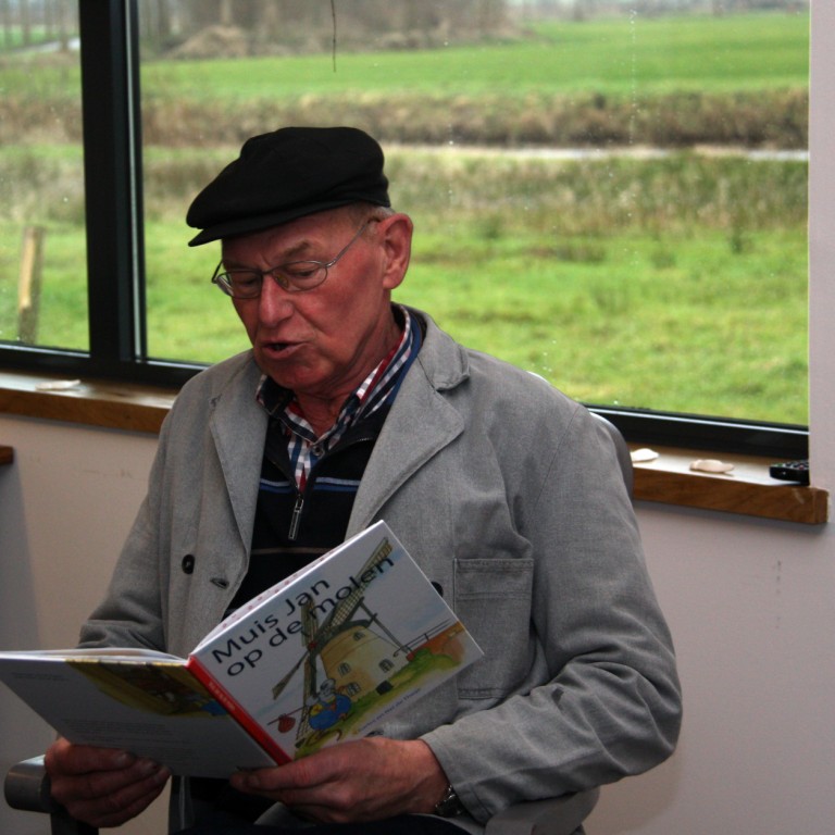 Ademloos luisteren naar de avonturen van muis Jan op de molen. Voorgelezen door Opa Gijs en met mooie plaatjes op een groot scherm.