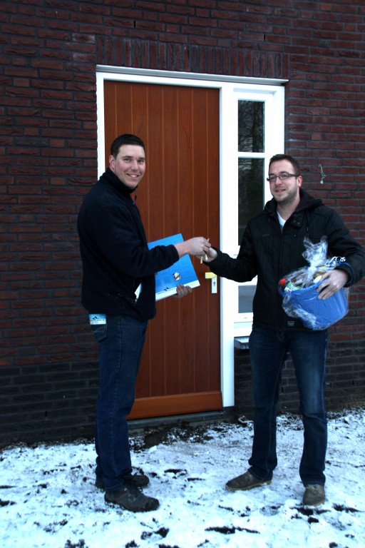 Martijn Dobbelsteen mocht als eerste bewoner van de Teerlingstraat op nummer 14, de sleutel in ontvangst nemen uit handen van uitvoerder Niels Verstegen van aannemersbedrijf Gebr. van Herpen. Ook de aannemer zelf, Antoon van Herpen, was naar Heeswijk gekomen voor dit feestelijk moment. Klik hier voor foto's.