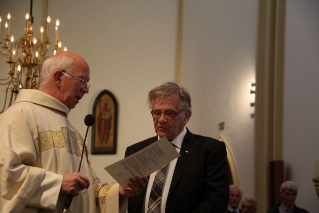 Na afloop overhandige pastoor Joost Jansen namens de parochie een oorkonde aan Grad van Krieken en spelde hem een speldje op als eerbetoon voor zijn 40-jarig jubileum als koordirigent.