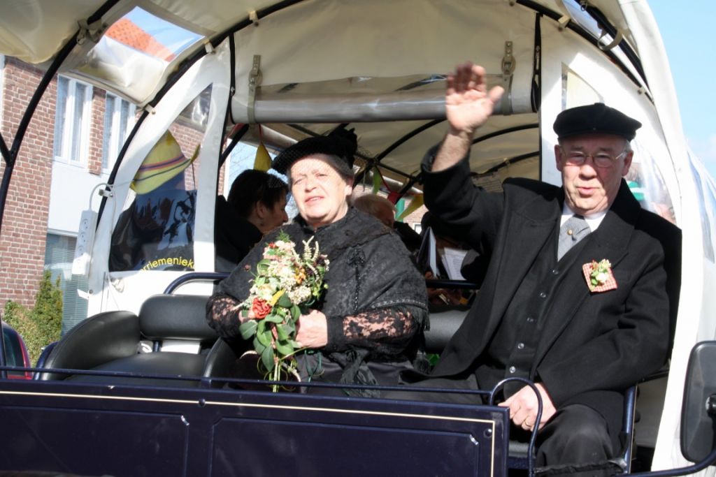 Een bijzonder feestelijke dag voor het boerenbruidspaar Wim en Maria Smits. Ze werden volledig verrast door de komst van een huifkar met blaaskapel De Durdreiers. Na een muzikaal welkom mochten ze voor op de bok een ritje maken naar Laverhof, waar ze werden onthaald op een smakelijke lunch samen met hun kinderen en kleinkinderen, andere familieleden, alle eerdere boerenbruidsparen en een aantal oud-prinsen.
