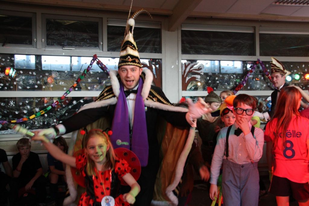 Hoogtepunt van het carnavalsfeest op de Bolderik was vanmiddag het bezoek van Prins Bart d'n Urste met zijn gevolg. Er werd volop gezongen en gedanst en natuurlijk was er een polonaise. Prins Bart deed volop mee. Ook voor hem was het een feest om de Bolderik te bezoeken. Tot slot werd de jarige juf op de schouders gehesen.