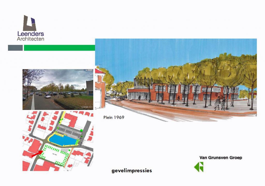 Ton Langendijk, stedenbouwkundige van de gemeente Bernheze en Hans van den Tillaart van Leenders Architecten laten op tekening zien hoe het plein er met bebouwing met een paar woonlagen eventueel uit kan zien. Nu heeft het plein een afmeting van 100 bij 100 meter. De bedoeling is om het plein een stuk kleiner te maken, nl. 66 bij 66 meter, zodat er een intiemer karakter ontstaat met een speelse invulling voor bijvoorbeeld horeca en een kiosk, maar er ook nog ruimte is voor de wekelijkse markt en voor evenementen zoals Koningsdag.