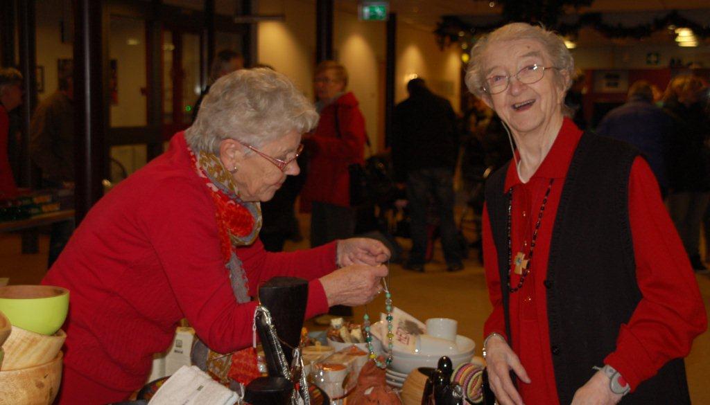 File in de gangen van Cunera en de Bongerd tijdens de kerstmarkt. De bewoners werden heerlijk voortgeduwd langs alle kramen of maakten een wandeling , vaak begeleid door hun familie. Er was dan ook genoeg te zien en te koop. Van handwerkspulletjes tot kerstbrood en van bloemen tot sieraden. En dan werd je ook nog op verschillende plekken toegezongen door koren uit Heeswijk-Dinther met mooie kerstliederen.