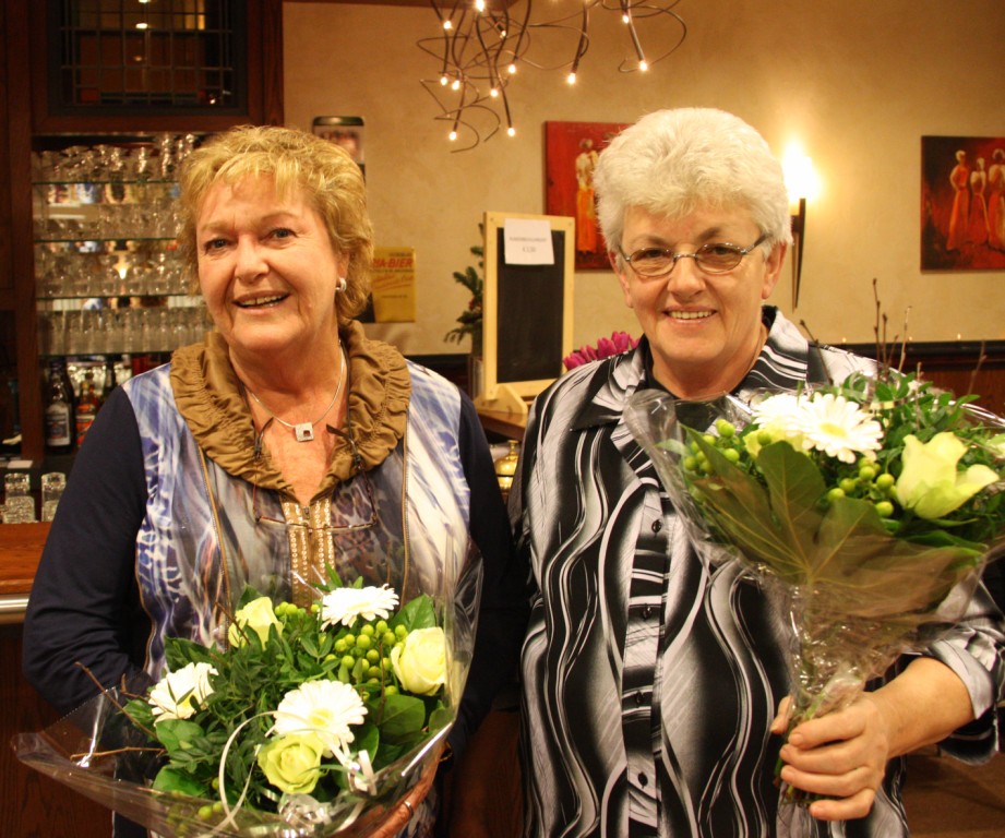 De vrijwilligers, die 12½ en 25 jaar met grote toewijding hun bijdrage leverden, ontvingen uit handen van coördinator Karin van Kraay een grote bos bloemen.