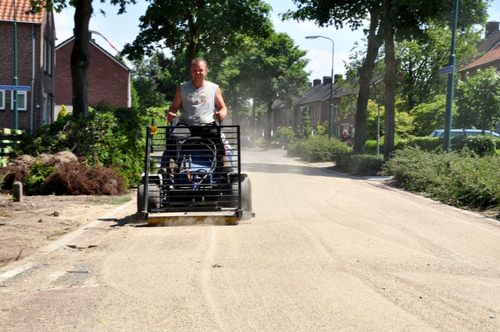 ‘’Vijf jaar geleden zijn we gestart met voegwerken ter bestrijding van onkruid van voornamelijk oude straten met gebakken klinkers. We werken met twee componenten materiaal dat in de voegen wordt gespoten .De volgende tien jaar heeft men dan geen last meer van onkruid.We blijven letterlijk aan de weg timmeren en ik ben trots dat het werk aan de Pastoor Maasstraat zo snel is gegaan met weinig verlet ondanks het koude weer, een mooi stukje werk al zeg ik het zelf''.