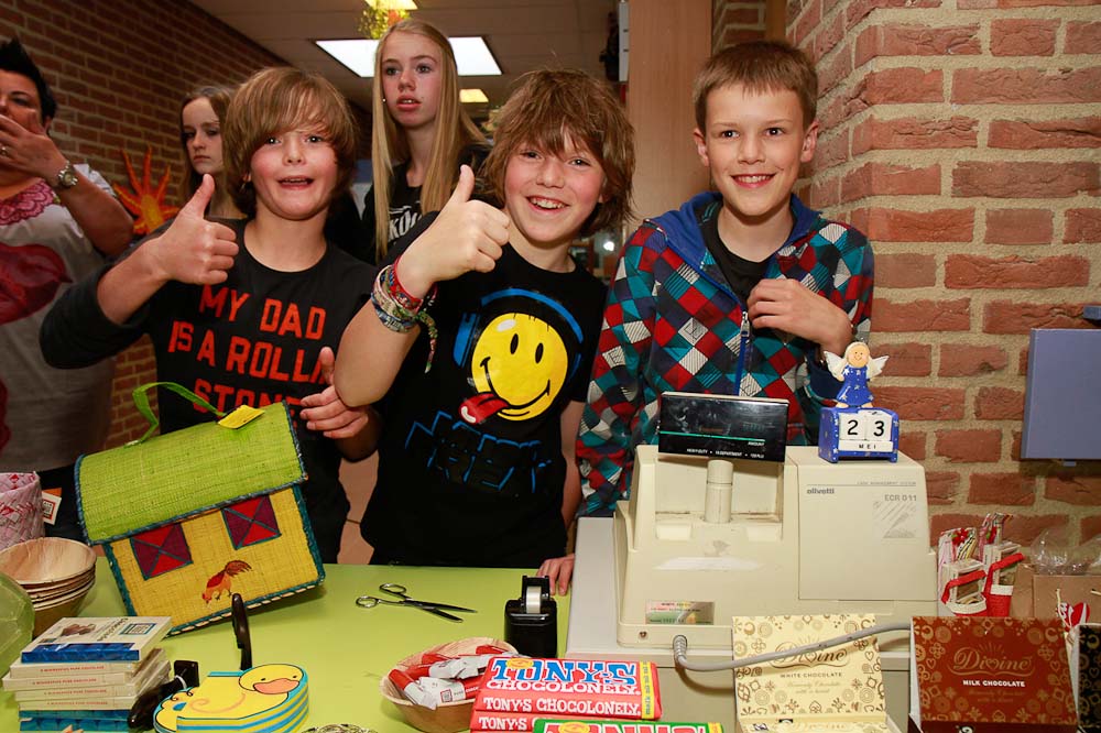 Kinderen van 't Palet hebben afgelopen tijd geld ingezameld. De actie werd gisterenavond afgesloten met een markt waar je spulletjes kon kopen, voorstellingen zien, eten, taart gooien naar de leraren (wie zou dat niet willen!) en spelletjes doen. Er was zelfs een heuse dienstenveiling waar aanwezigen konden bieden voor de aangeboden diensten van de leraren, zoals cupcakes maken, strijken (geen witte was!), pizza's bakken en voorlezen. De actie heeft EUR 7000,- opgeleverd.