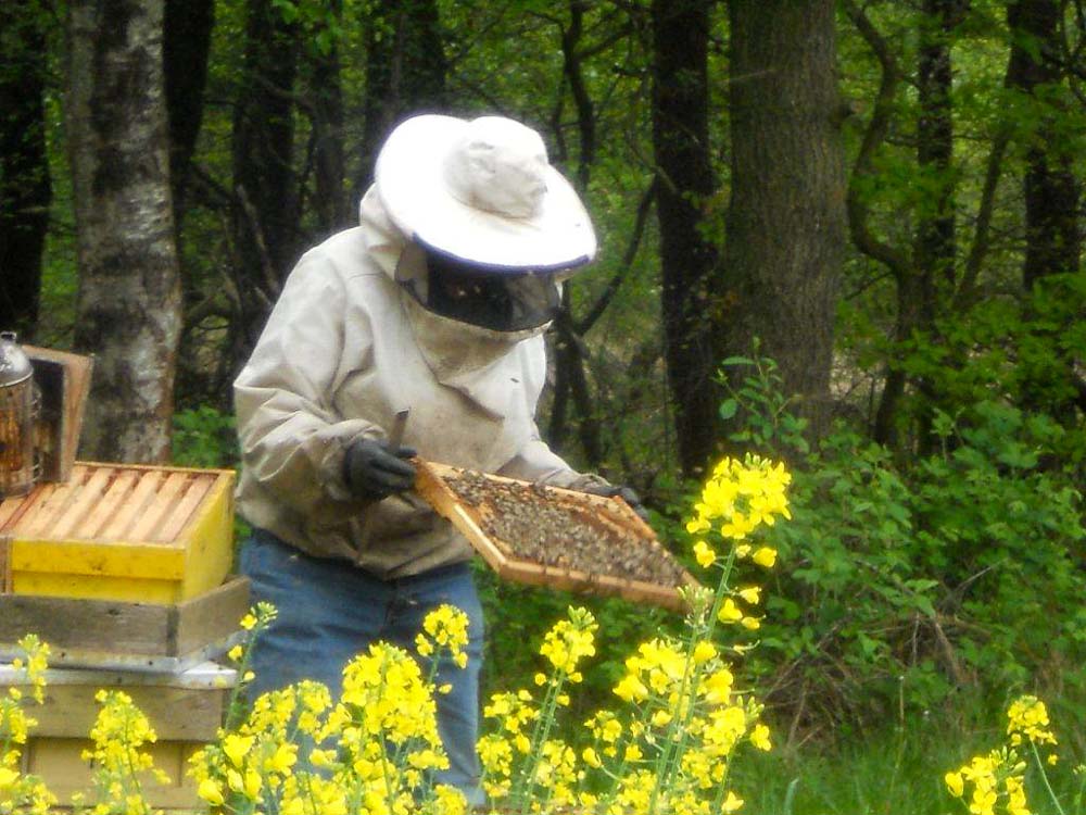Maar dan toch nog een grotere verrassing...er staan tien bijenkasten aan de rand van het veld en imker v.d. Maazen is juist bezig om de kasten te controleren.