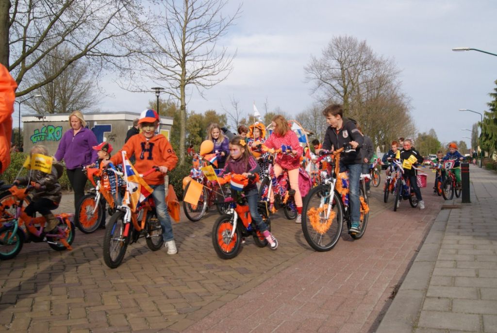 Vanwege de troonswisseling van Koningin Beatrix naar Koning Willem-Alexander was het programma door het oranjecomité dit jaar aangepast. De versierde fietsenoptocht kreeg vanavond haar plekje in het programma. Even na half 7 vertrok een bonte stoet vanaf de parkeerplaats bij gymnasium Bernrode, via Cunera de Bongerd naar Plein 1969. Hier werd de tocht afgesloten met het samen zingen van het Koningslied.