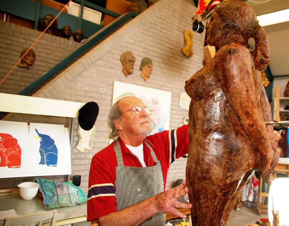 Als wij na twee uur zijn atelier gaan verlaten, trekt hij weer zijn werkschort aan en gaat verder werken aan zijn indrukwekkende vrouwenfiguur in was. En zwaait hij ons uit vanachter zijn raam.
