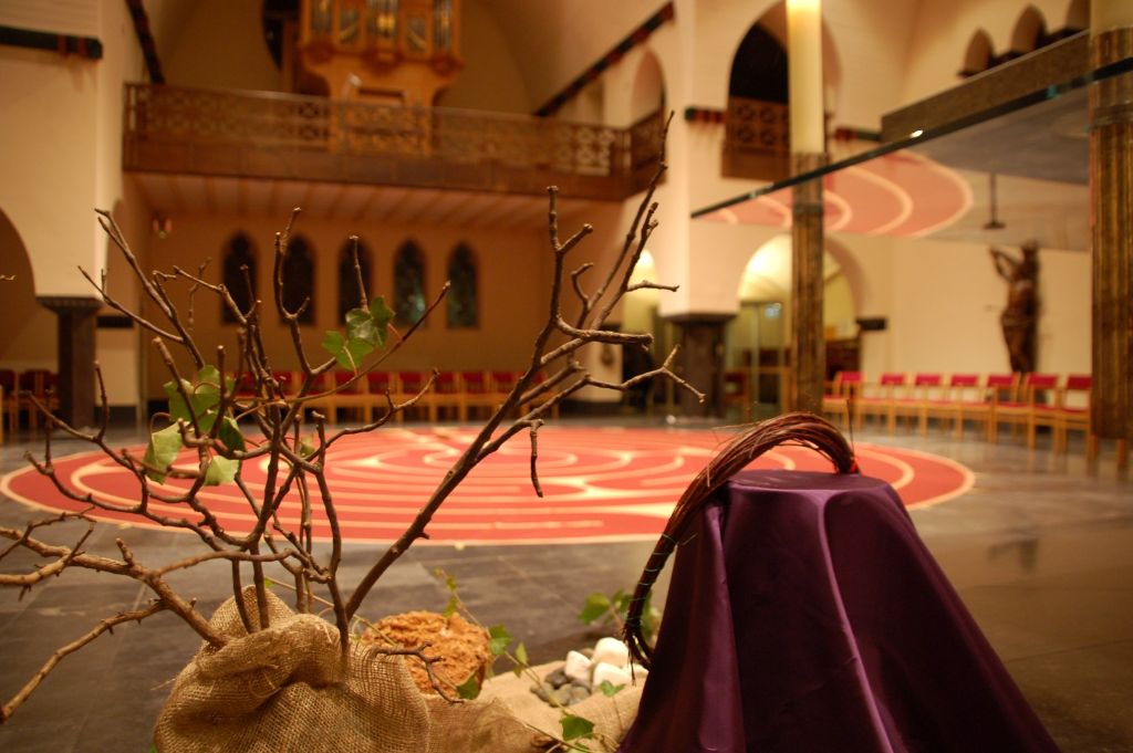 De stoelen voor het altaar in de Abdij hadden plaats gemaakt voor een prachtig labyrint, dat daar was aangelegd. Het bekendste labyrint ligt in de kathedraal van Chartres, maar vanaf nu tijdelijk in Heeswijk! Uit vele richtingen kwamen de mensen naar de Abdij toe, om het lopen van een labyrint te ervaren.
