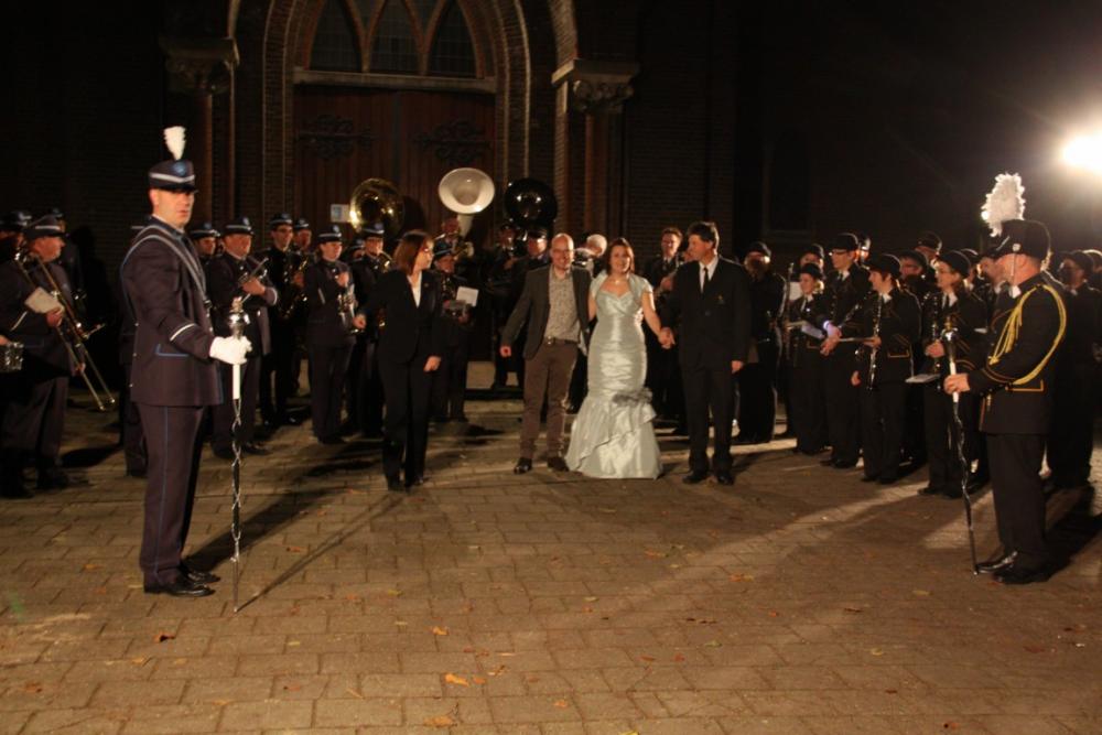 Rond half 8 vanavond was er bijzondere gebeurtenis op het kerkplein van Heeswijk. De Koninklijke Fanfare Sint Willibrord en harmonie Sint Servaes gaven een gezamenlijke serenade bij gelegenheid van het huwelijk van de 'Dintherse' Stephanie Verkuijlen en de 'Heeswijkse' Arnoud Boeijen. 90 muzikanten gaven een feestelijke tintje aan de dag van hun leven van 'een boeiend paar'.