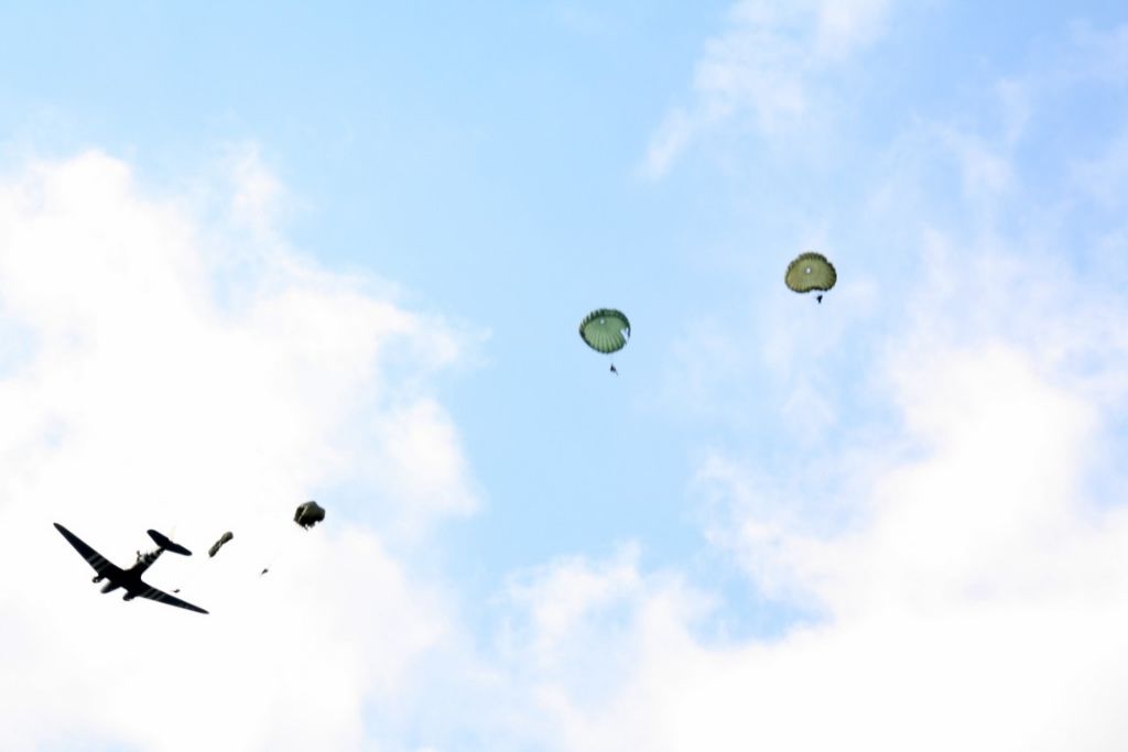 De Dakota liet lang op zich wachten, maar het was de moeite waard. Het gebrom van het originele Amerikaanse troepentransportvliegtuig klonk de vele toeschouwers als muziek in de oren. Enkele tientallen parachutisten sprongen op authentieke wijze uit het vliegtuig met een ronde bolparachute, een prachtig schouwspel. De meesten landden in het weiland, maar sommige parachutisten kwamen in een maisveld terecht.