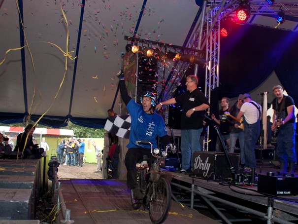 size het publiek verwennen. Zodra er met de finishvlag wordt gezwaaid knallen de mannen van WC Experience het complete dak weer van de tent.
