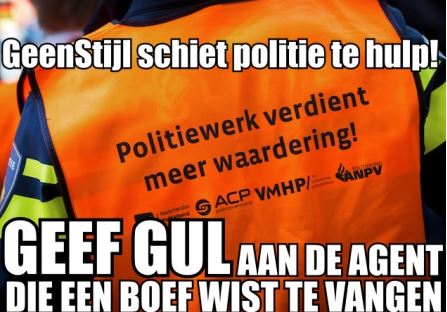 GeenStijl wil nu de politie te hulp schieten en heeft, zo meldt de site, inmiddels ruim 15.000 euro toegezegd gekregen. Motto van de actie is overigens 'Geef gul aan de agent die een boef wist te vangen'.