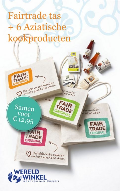 De Wereldwinkel wil u voordelig kennis laten maken met de noedels en kokosmelk. Dit doet zij door een speciale aanbieding tijdens de Fair Trade Week, welke start op 26 oktober. Voor € 12,95 ontvangt u een Fairtrade shopper gevuld met 6 Aziatische kookproducten. Het betreft hier een eenmalige actie waarvoor geldt: op = op.